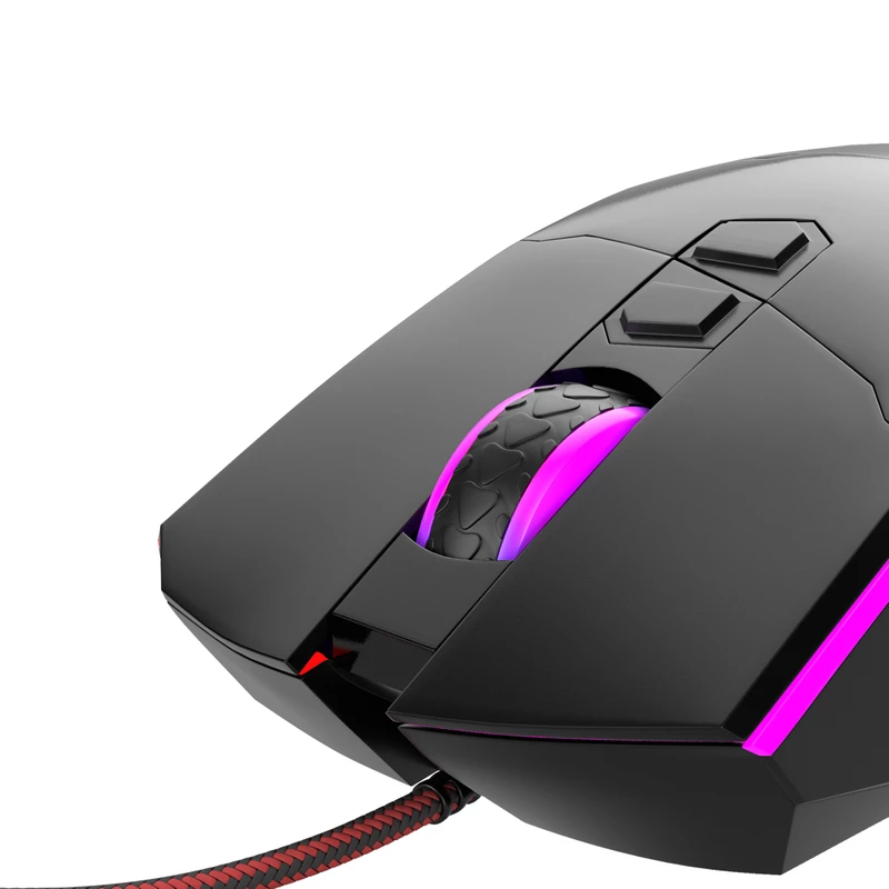 RGB Lighting (۱۳Modes) + gamming mouse design + MIX ۱۲۸۰۰ DPI+ ۸ keys+ CPS MAX ۲۰ Optical Gaming Mouse dpi ۱۲۸۰۰ PollingRate ۱۰۰۰H ۸ programmable Buttons with exclusive software Omron Switches, ۵۰,۰۰۰,۰۰۰ Clicks Guaranteed Ergonomic design ۱.۸m Braided Cable